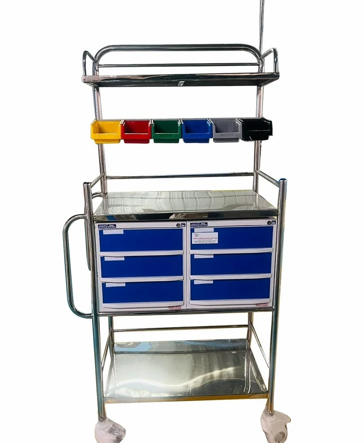 | Package Contents | Cylinder Cage, Buffers, Plastic Bins, I.V. Rod SS, Six Drawers Plastic, Tray SS Inbuilt & Casters |